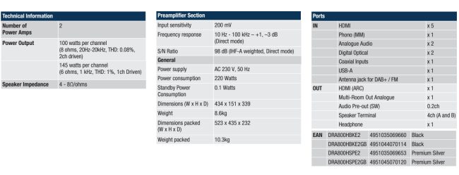 HiFi sound quality from limitless analogue and digital sources with the new Denon DRA-800H two-channel HiFi network receivers. With FM/DAB+ radio, a wide array of connectivity including Phono input, Wi-Fi integration and HDMI, you will upgrade your listening and home theatre experience in every aspect. The DRA-800H integrates seamlessly with your TV, music services, voice control and smart devices