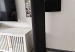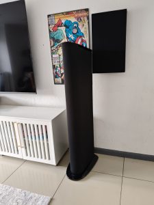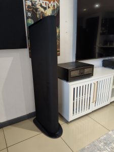 - Design: A “sock” covered, slender tower design with a 12.4-inch wide base for stability, making it visually unobtrusive despite its power.