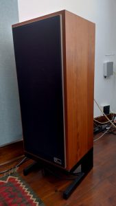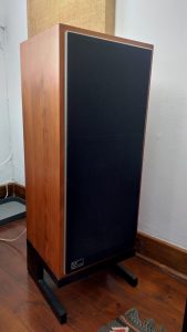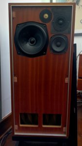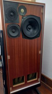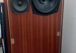 The IMF ‘TLS’ are advanced versions of the transmission line reproducer which was developed some years ago to aid in laboratory research. These speakers are for use with the best equipment. A ‘TLS’ is a sophisticated speaker; its virtues will not be apparent to the novitate who will want something more obvious. A free standing loudspeaker system measuring approximately 36″ x 14″ x 15′ wide. Bass unit S’ foam surround impregnated diaphragm, mid – range 5″ impregnated cone contained in separate line, tweeter 1 1/8″ soft dome and 3/4″ chemical dome super-tweeter. Crossover electrical four way at approximately 375Hz, 3kHz and 13kHz. Frequency range 23Hz to beyond audibility. Calibrated level controls – 2dB for mid and high frequencies. Efficiency measured via pink noise 1 metre on axis : 50 watts produces 100dB. Nominal impedance 8 ohms. Driving power requirement 25 to 60 watts.