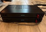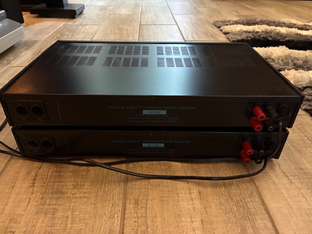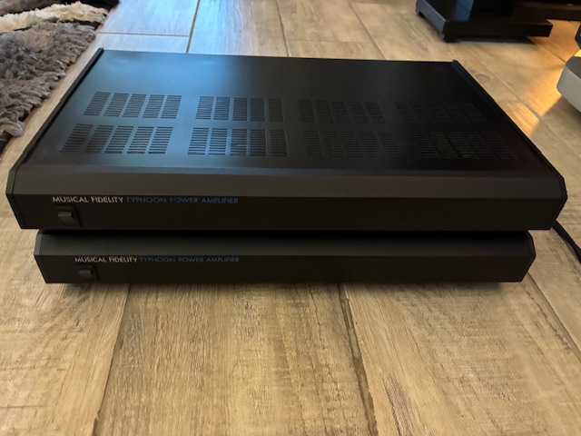 The **Musical Fidelity Typhoon amplifier** features a continuous power output of **45 watts per channel** into 8 ohms and can deliver up to **150 watts** in bridged mono mode.