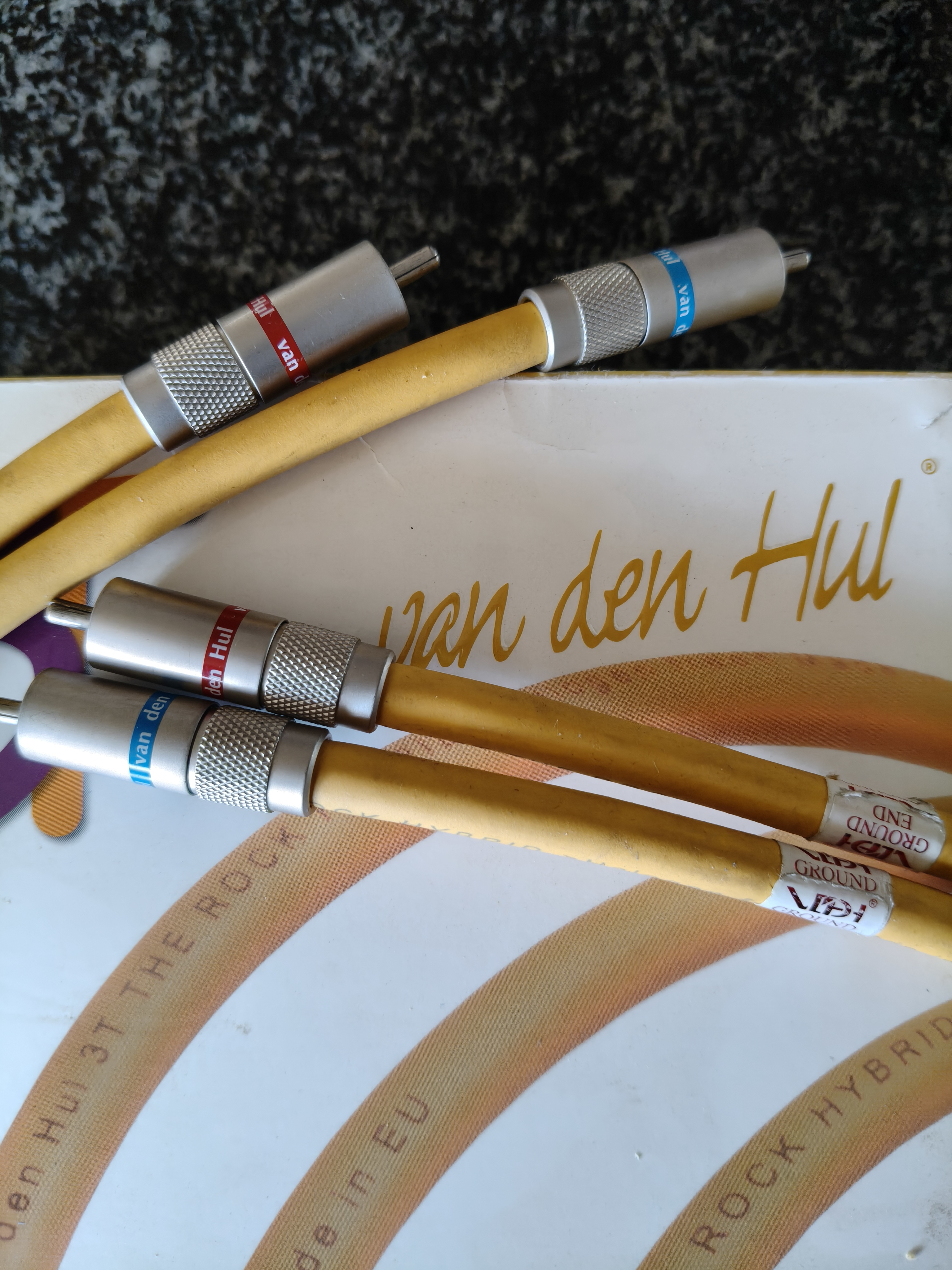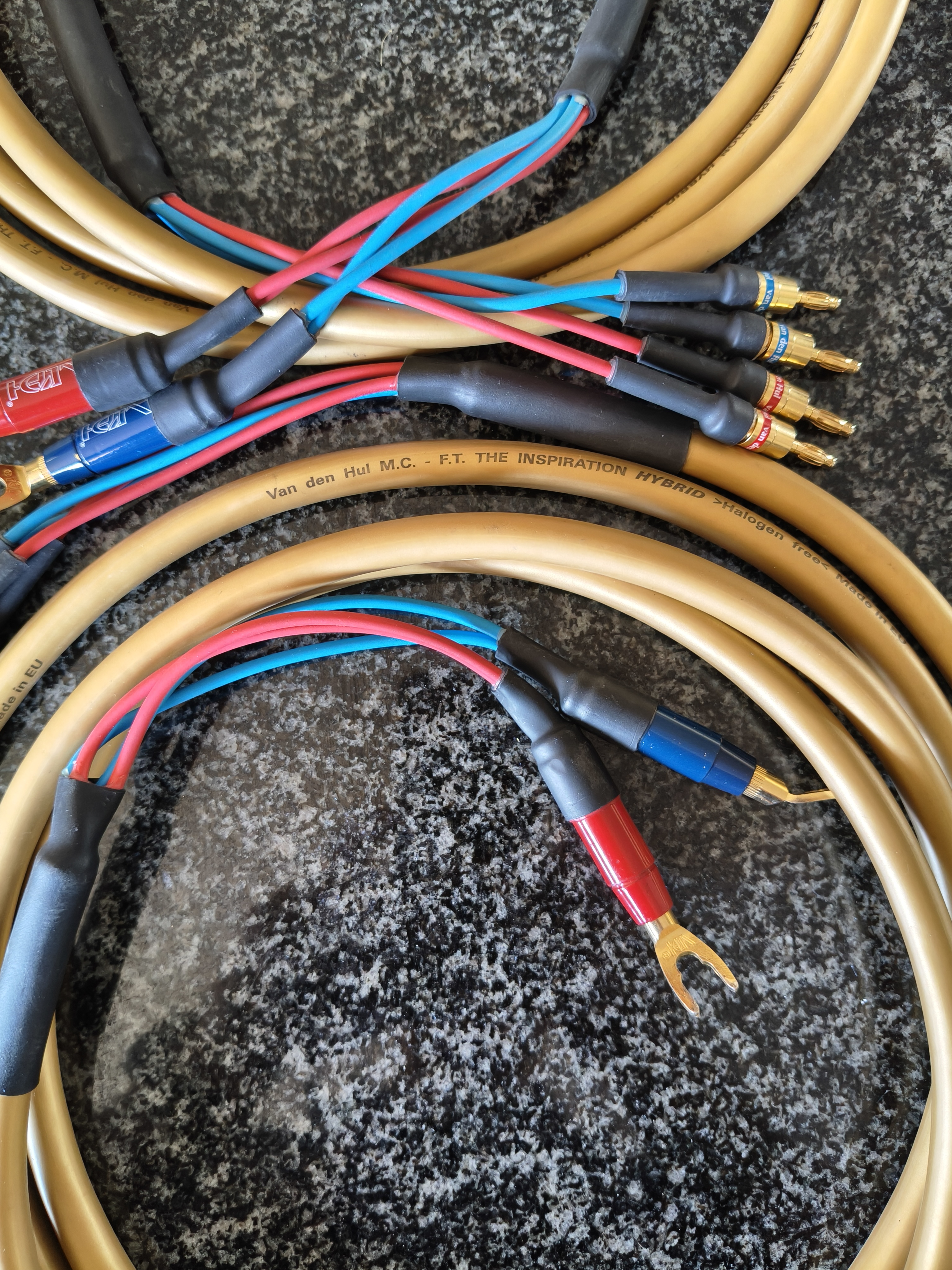 Well known Van den Hul high end audio cables in excellent condition. Just over a year old. They were used with B&W 800 series speakers and performed very well. These cables are offered at a bargain price considering the age.