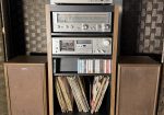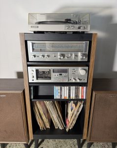 • Original Audio Rack: Mid-Century Modern wood-veneer rack with integrated vinyl storage.